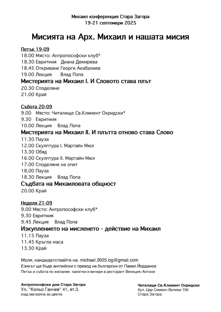 По темата за Школата на Михаил, в програмата са включени Евритмия, Арт уъркшоп и време за споделяне на опит за изграждане на по-задълбочено разбиране. Разглежданите на конференцията въпроси ще играят все по-голяма роля в Антропософското движение през следващите години.